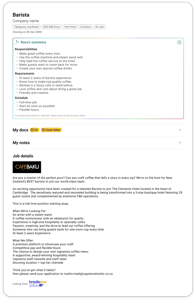 - Ruru’s Summary: An AI-generated summary by Te Heke Mai that highlights key responsibilities, requirements, and other important details of the role